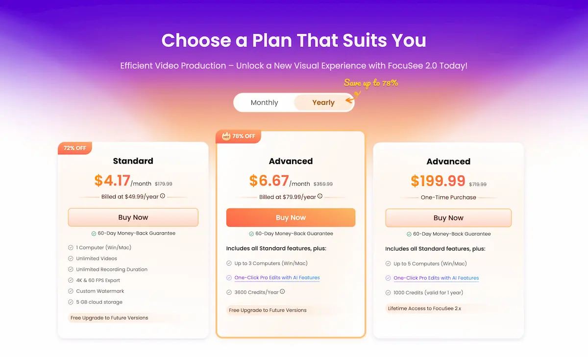 FocuSee appears to be a useful tool for individuals or businesses looking to create instructional or demonstration videos. The automatic enhancements it offers can save users time and effort in post-production, resulting in more professional-looking videos. Additionally, the option for one-time purchase plans with lifetime updates adds value to the software.