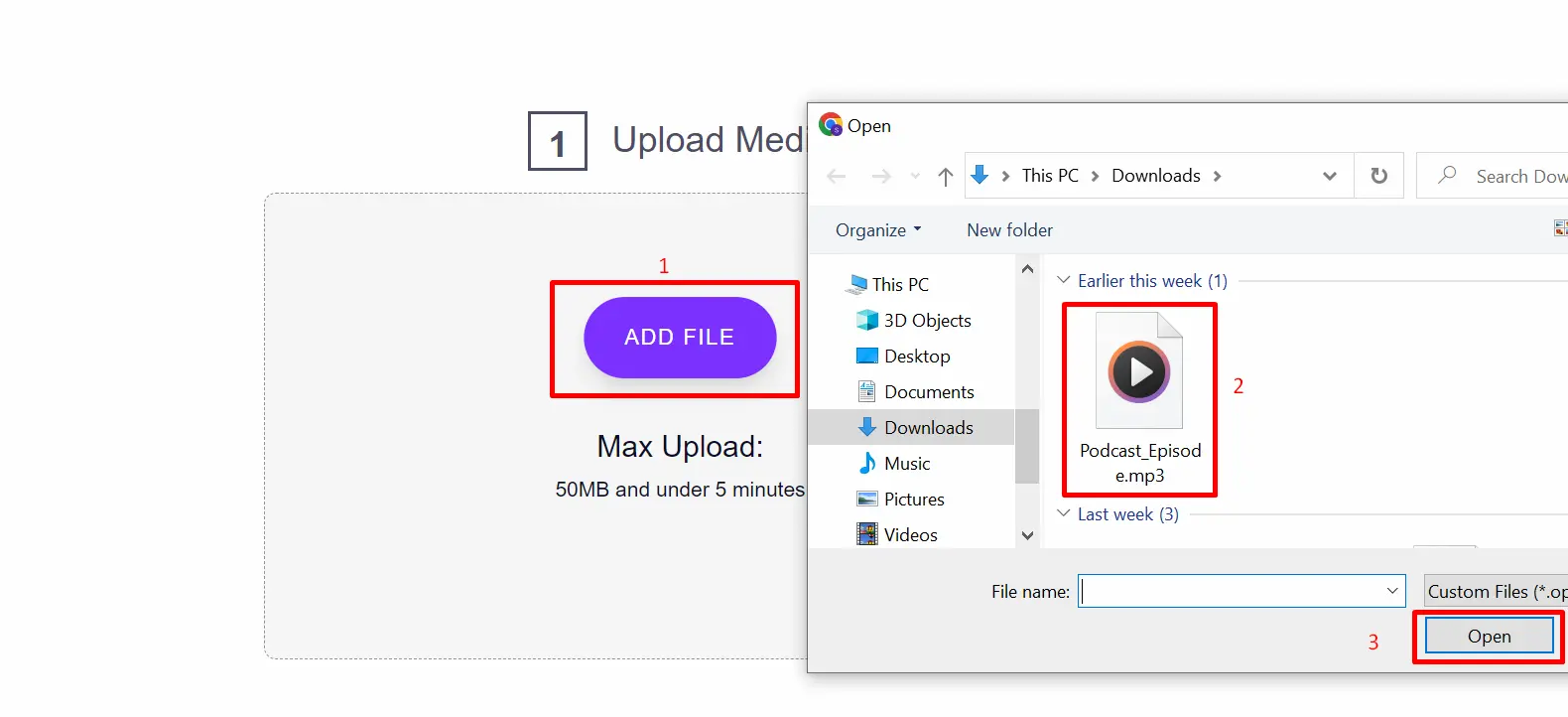 Begin by uploading the audio or video file you want to enhance. You can easily do this by clicking the "Upload File" button on the tool's interface. Let's say you have a podcast episode titled "Podcast_Episode.mp3."