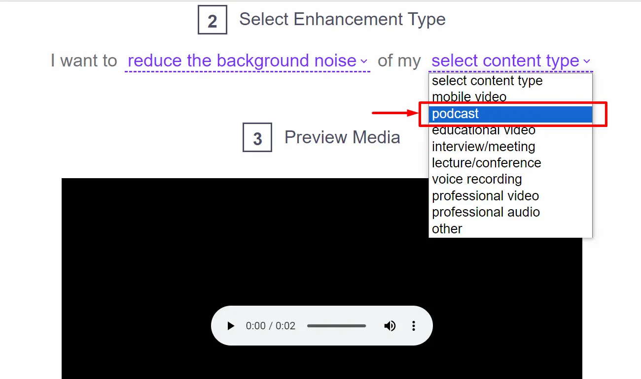 Now, it's time to specify the type of content you're working with. This helps the tool optimize its enhancements for your specific needs. Let's say you are editing a podcast episode. In this case, select "podcast" as the content type.